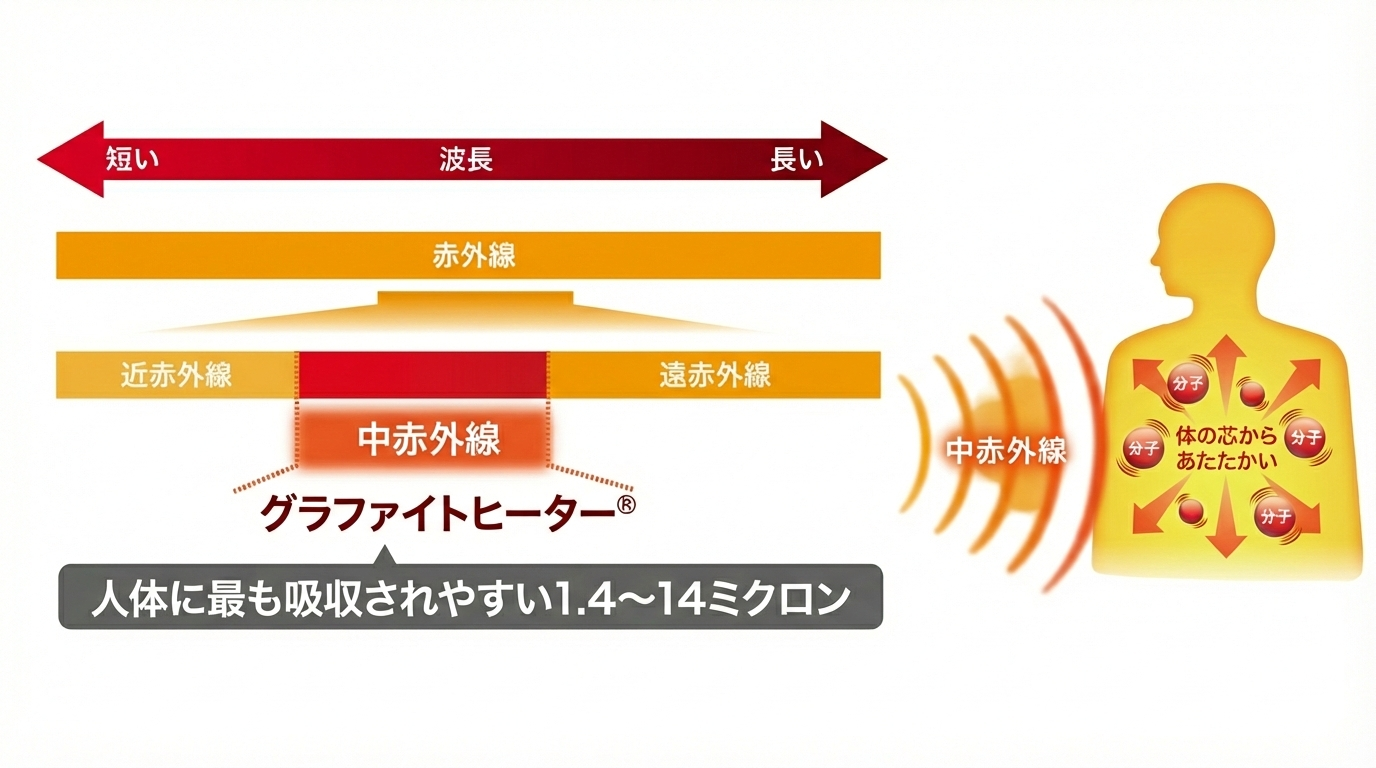 とはいえアラジン独自のグラファイトヒーターは、近赤外線と遠赤外線の特性をあわせ持つ「中赤外線」を使用。